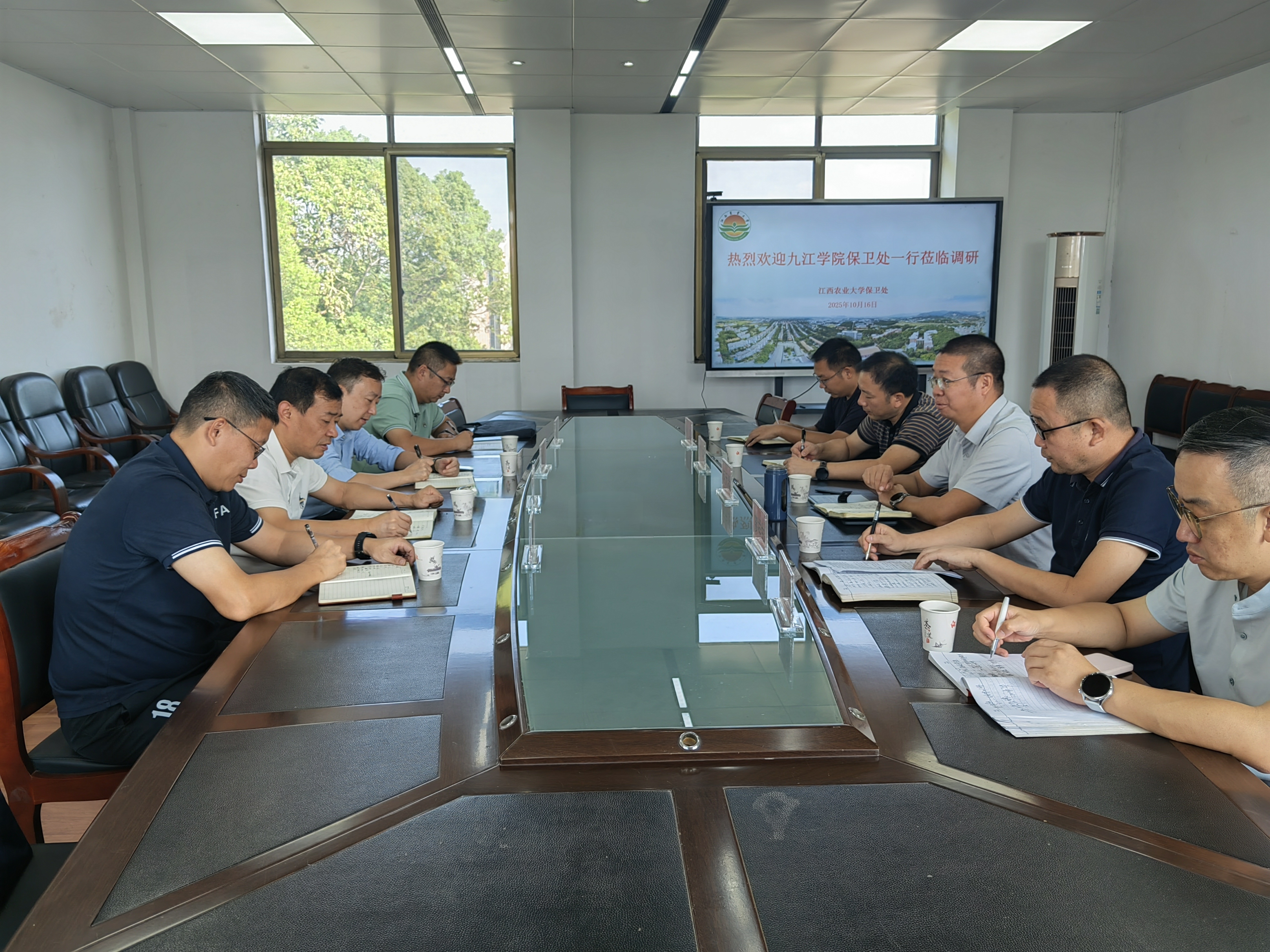 2025年10月16日上午,九江学院保卫处处长郭青一行4人到学校保卫处进行工作调研。保卫处处长何元琴主持调研座谈会,综治消防科、治安秩序科、政保科相关负责同志参加座谈。